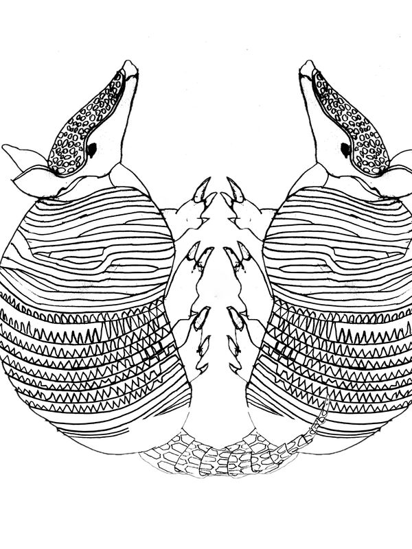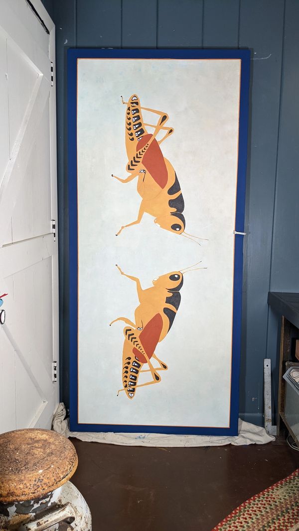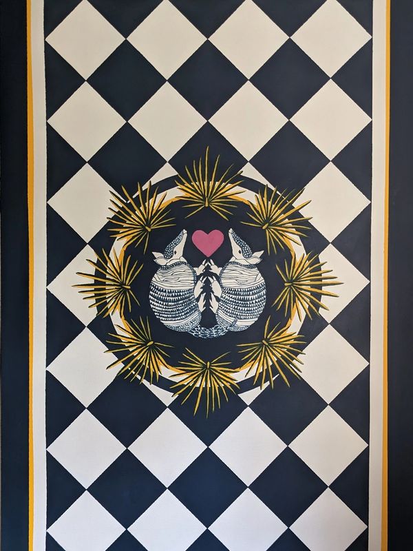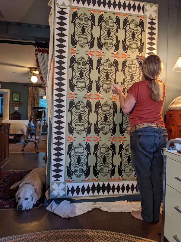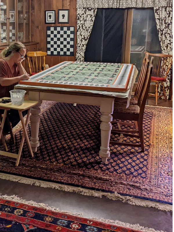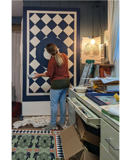 Working on the Armadillo and Palmetto floorcloth in A.R.T. Studio