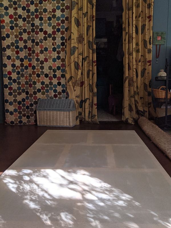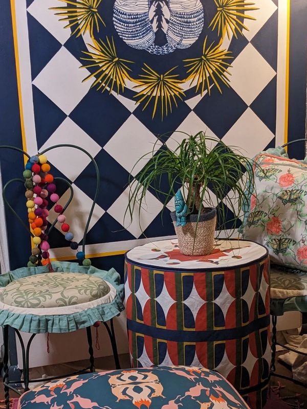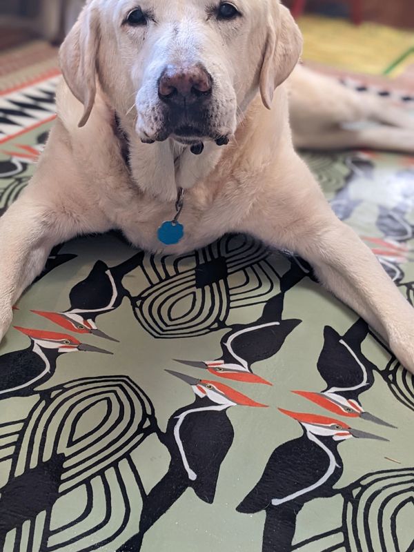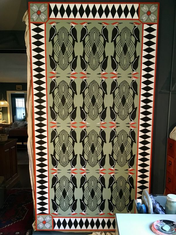 My floorcloths are my masterworks, and a true labor of love. They can take anywhere from two weeks for a 3X3 floorcloth with a simple design, to three months for a 46"X84" floorcloth and more detailed or layered designs. Every floorcloth presents a unique set of challenges and new technical discoveries.