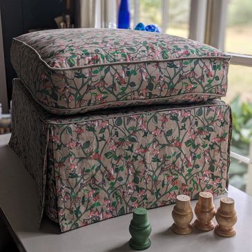 I love to reupholster ottomans, as they are perfect small canvases for showcasing my fabric designs