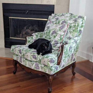 Two of these heirloom chairs were delivered home to a happy customer, and cat approved! The finished results are the culmination of a joyful and thoughtful collaboration with my clients: from selecting the A.R.T. fabric and choosing a colorway that reflected their desire to add color and light, and tie in with their surroundings and home, to carefully deconstructing the chair and replacing the worn spring system, to building up a firm but luxurious foundation for comfort and wear, to meticulously placing the pattern of the top fabric and finishing details.