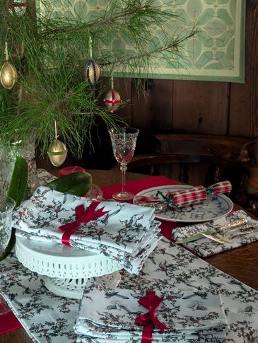 I delivered a table runner and dinner napkins in my "Mockingbird and Pyracantha" pattern to their new home -- I love to think that these linens will be part of someone's holiday festivities! We are decking the halls here at home, too. It's so good to have everyone together again. Happy, Happy Holidays!