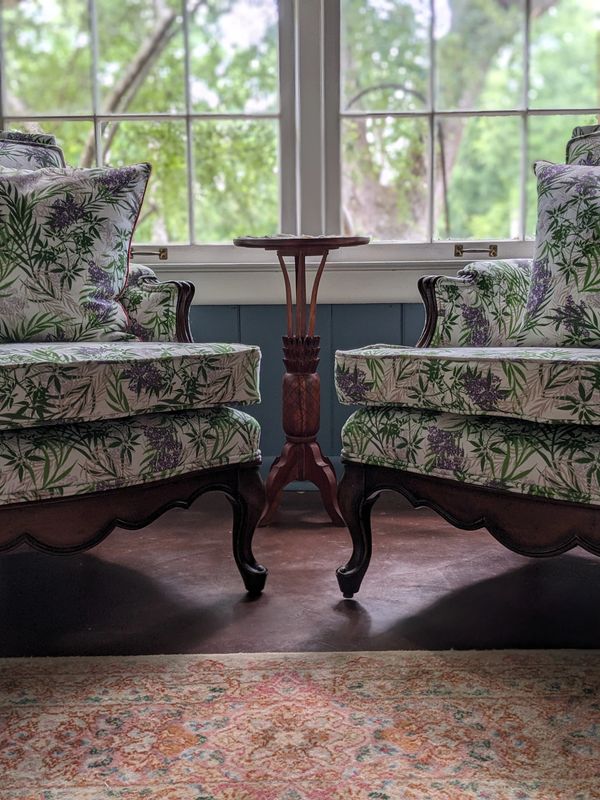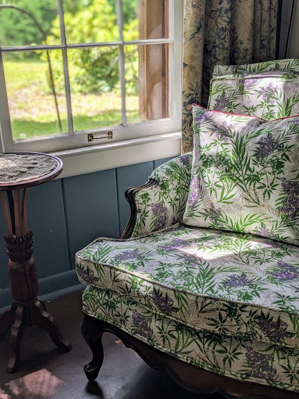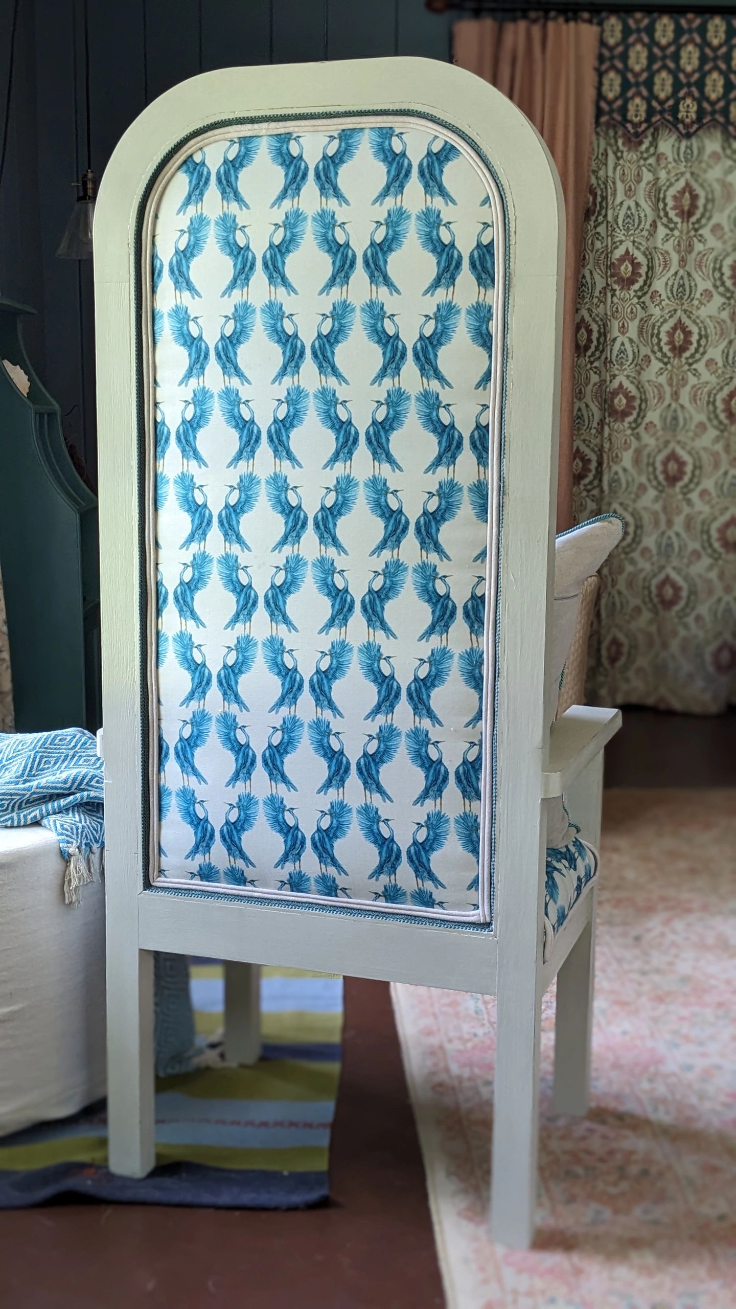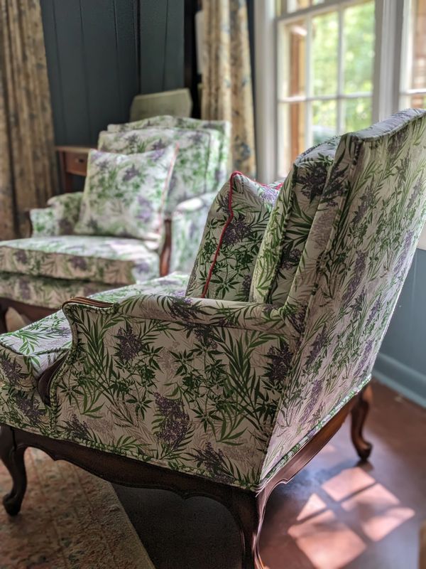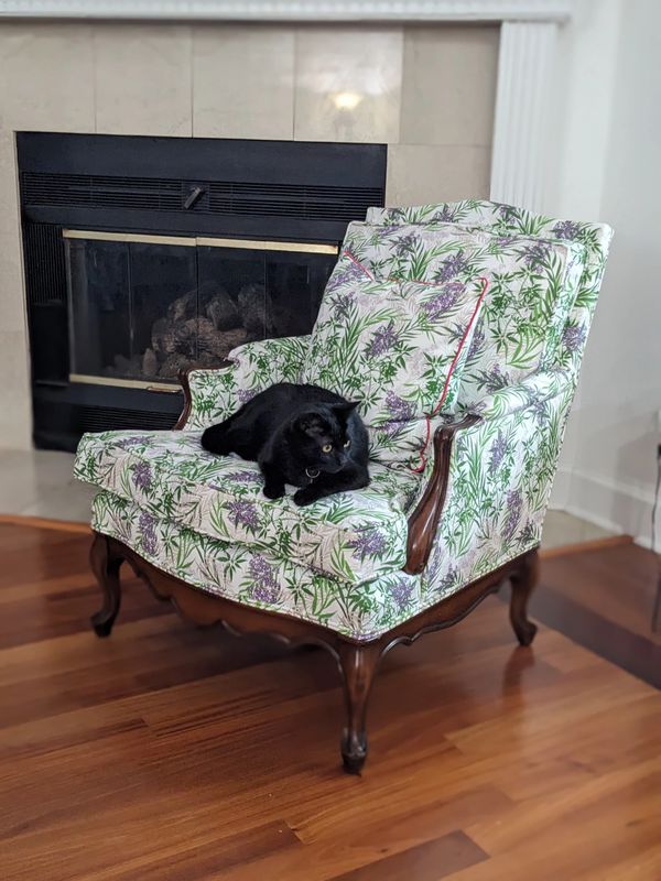 Two heirloom chairs were delivered home to a happy customer, and cat approved! The finished results are the culmination of a joyful and thoughtful collaboration with my clients: from selecting the A.R.T. fabric and choosing a colorway that reflected their desire to add color and light, and tie in with their surroundings and home, to carefully deconstructing the chair and replacing the worn spring system, to building up a firm but luxurious foundation for comfort and wear, to meticulously placing the pattern of the top fabric and finishing details.