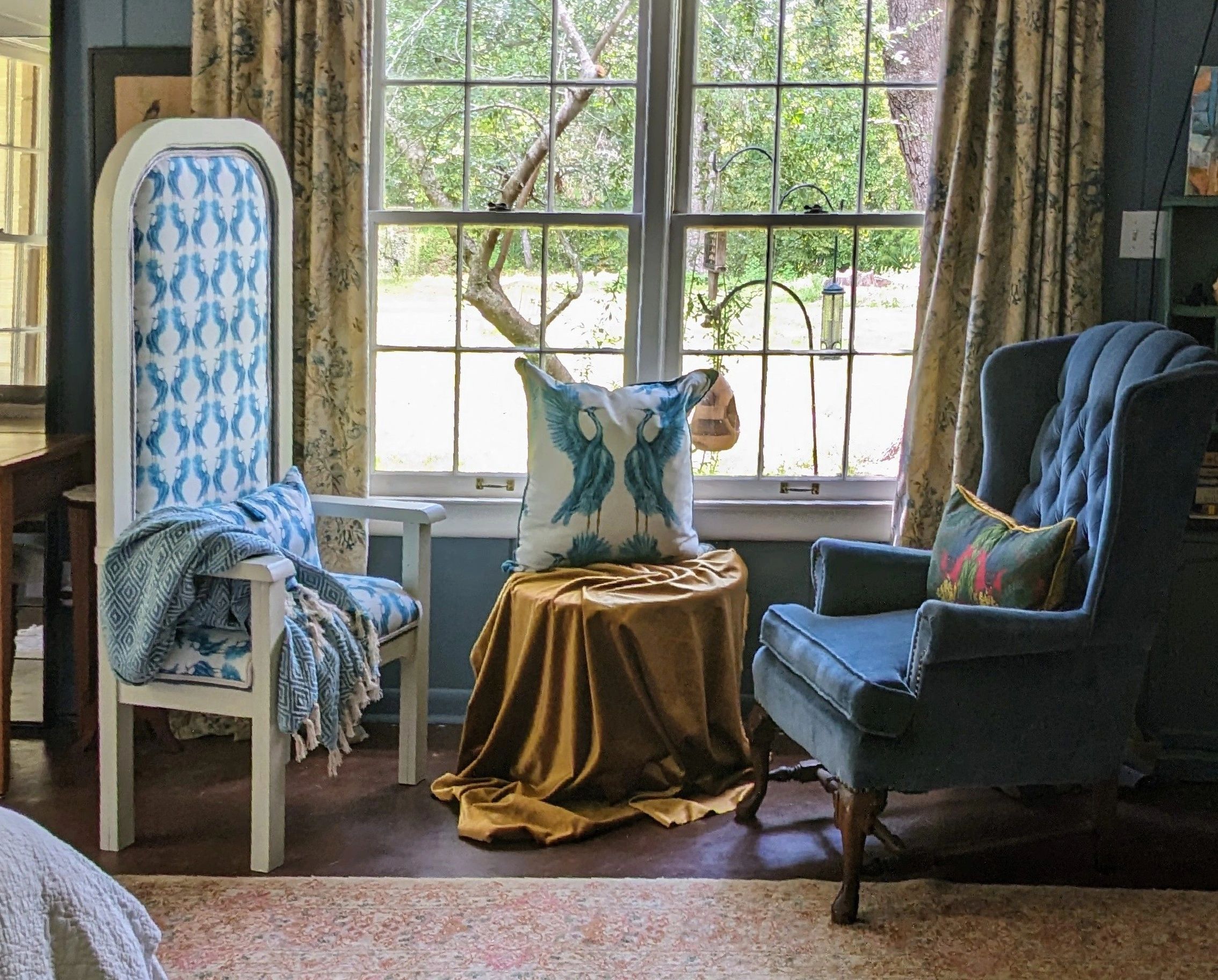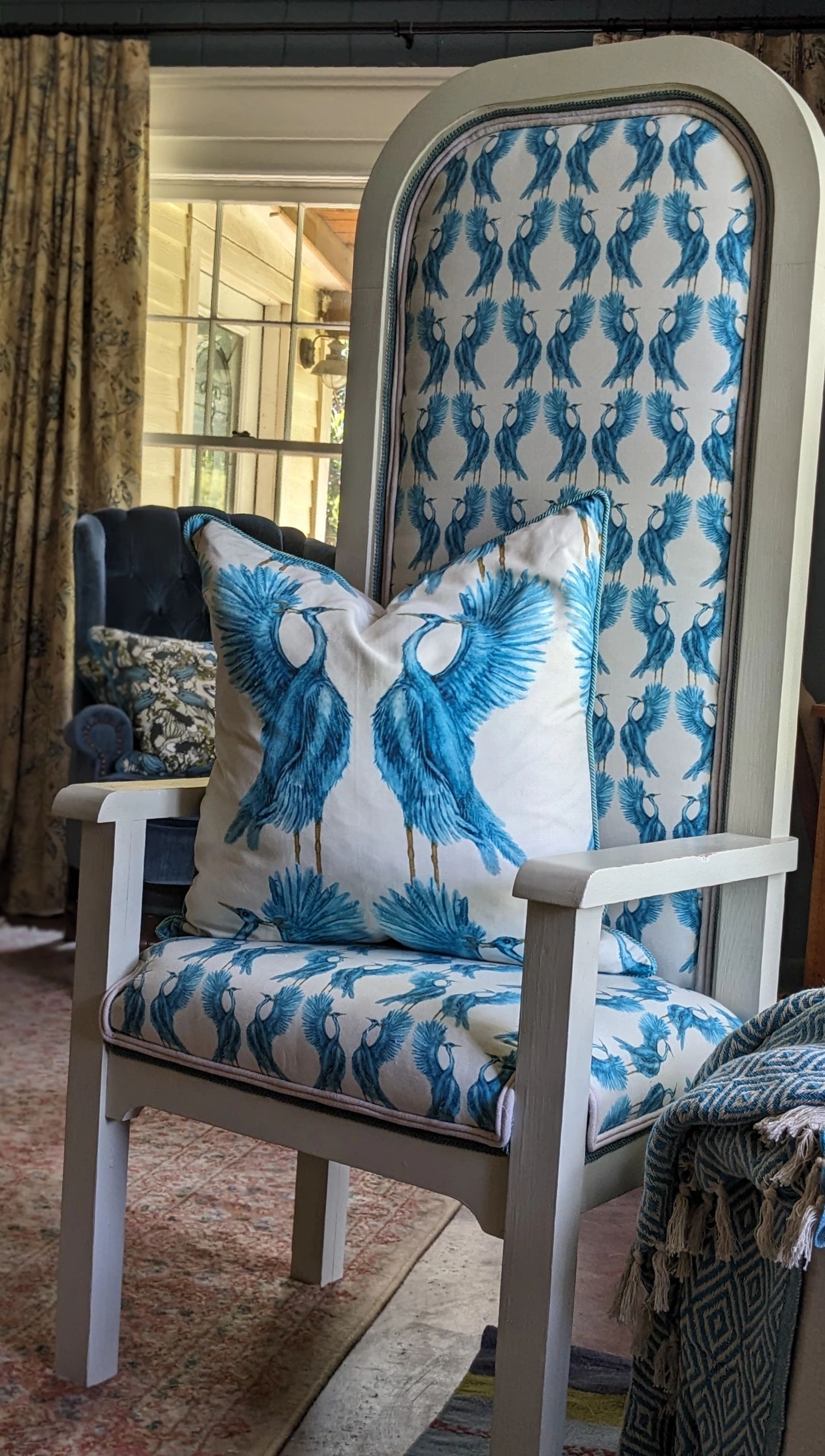 Blue Herons in watercolor create an undulating pattern on the back and front of this statement chair. Gold velvet draped over the table and adorning the back of the Deer and Pyracantha cushion exaggerates the ostentatious proportions of the chair. Found linen curtains ground the vignette, and bridge these playful pieces with the natural setting of the bird window in a relaxed space.