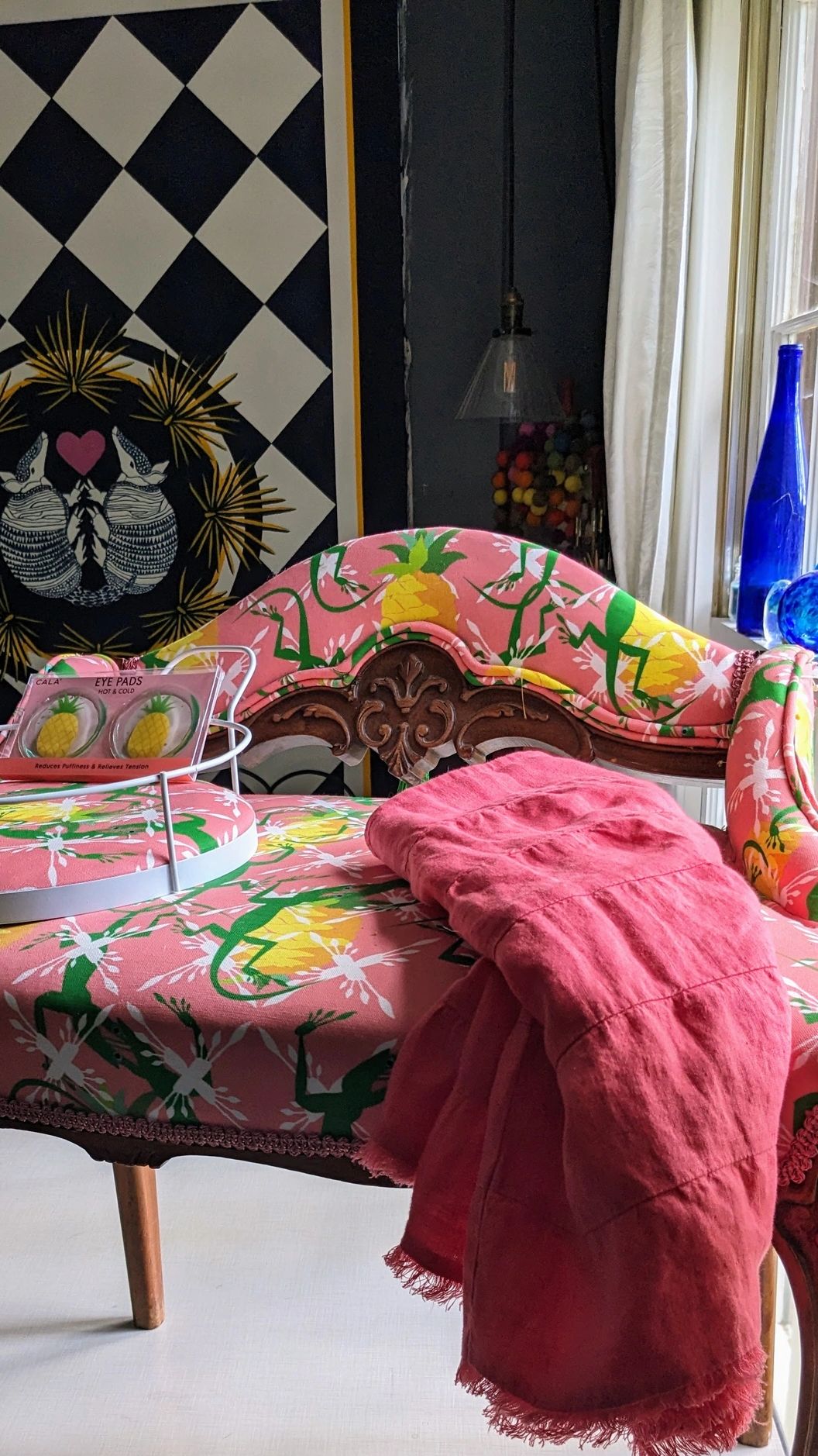 Fighting green anole lizards and pineapples (Pineappanoles) add sass and pure fun to the stately frame of this vanity bench. I couldn't resist purchasing the "eye pads" to go with -- they were meant to be!