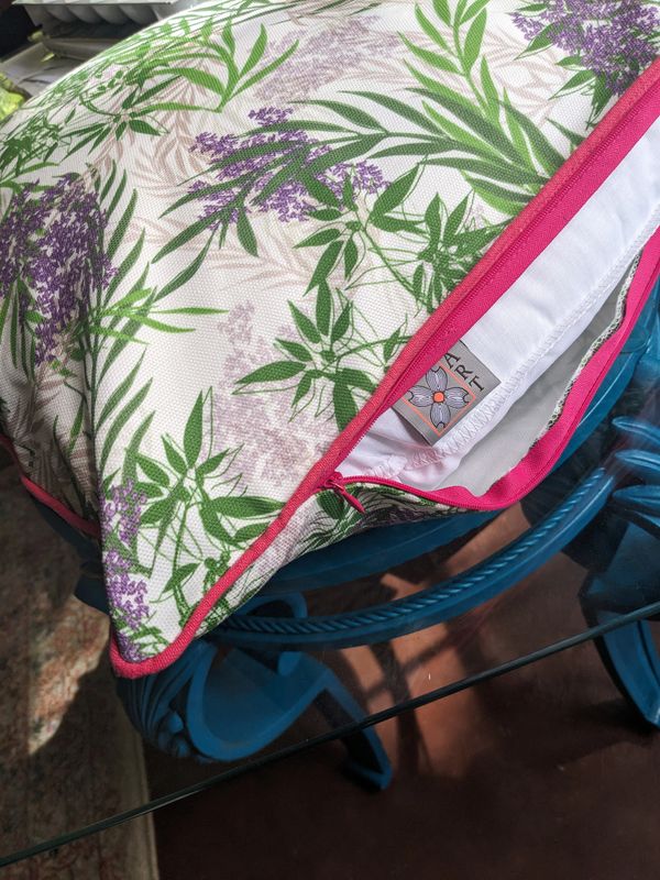 Hummingbird and Datura on linen-cotton blend adorns this lovely little vanity bench.