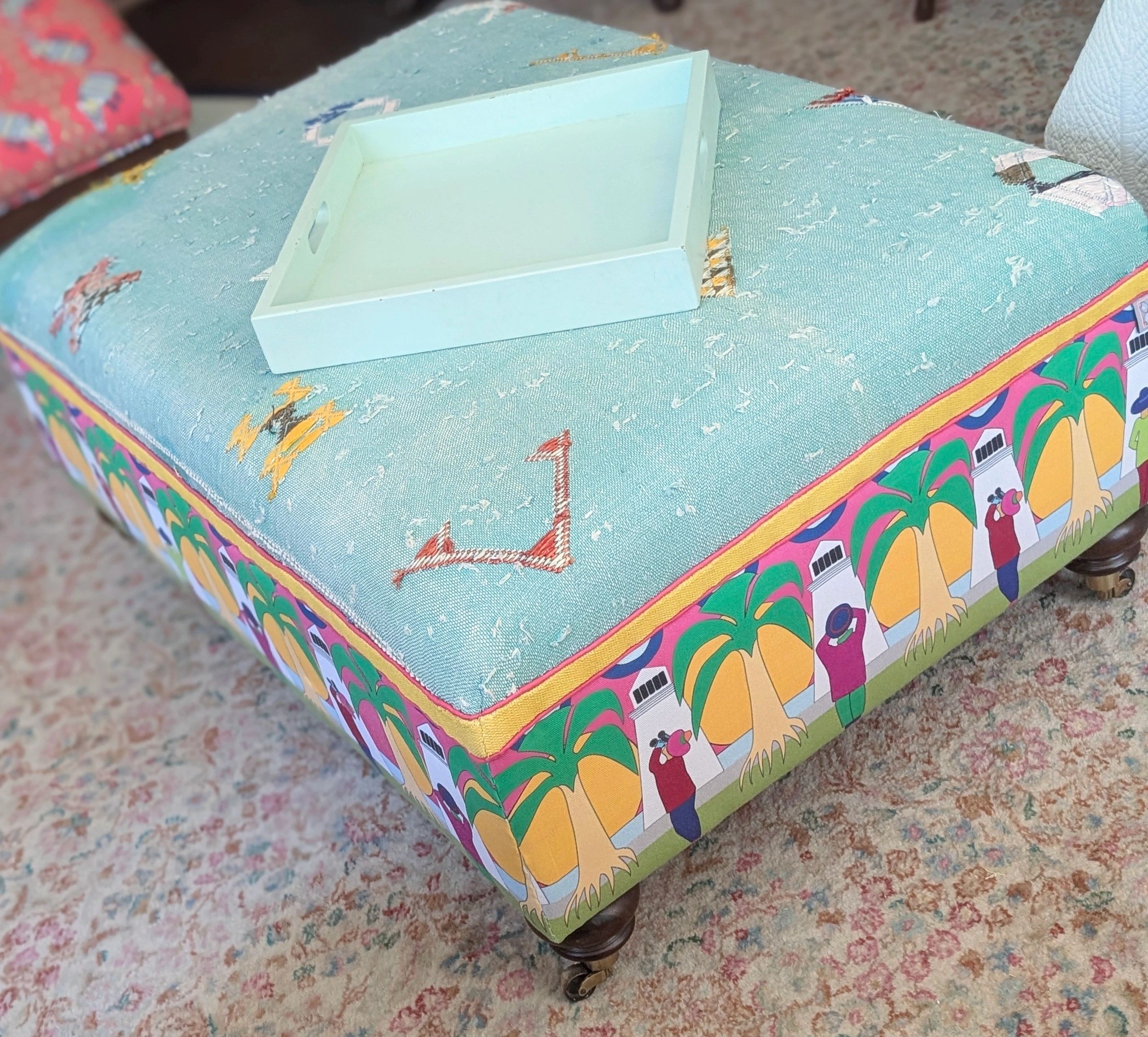 A.R.T. "Birdwatchers" is inspired by the birdwatchers of St. Marks Florida, but the lighthouse and palm-flanked vignette has a worldly appeal that makes a perfect pairing with the found Moroccan rug on this A.R.T. upholstered ottoman.